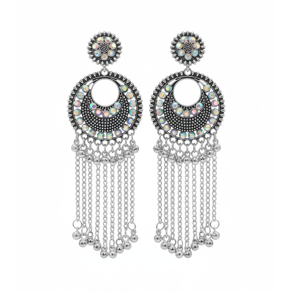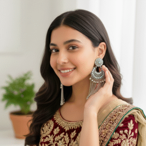 Enhance your ethnic charm with these Antique Silver Finish Chandbali Earrings! Featuring a classic chandbali design with a vintage silver finish, these earrings are perfect for weddings, festivals, or casual ethnic wear. Lightweight and elegant, they add a touch of tradition and style to any outfit. Ideal for women who love timeless, ethnic-inspired jewelry and want to make a statement effortlessly.